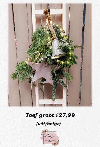 Toef groot (wit/beige) is een toef gemaakt in witte, beige en zilveren tinten. De toef is ongeveer 50 a 60 cm lang. Inclusief verlichting, met warm licht.