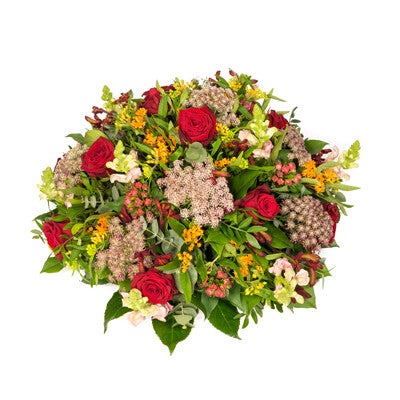 Biedermeier Trend en Stijl is een rouwarrangement wat zich kenmerkt door het gebruik van verschillende bonte kleuren en is verkrijgbaar in 3 verschillende maten.