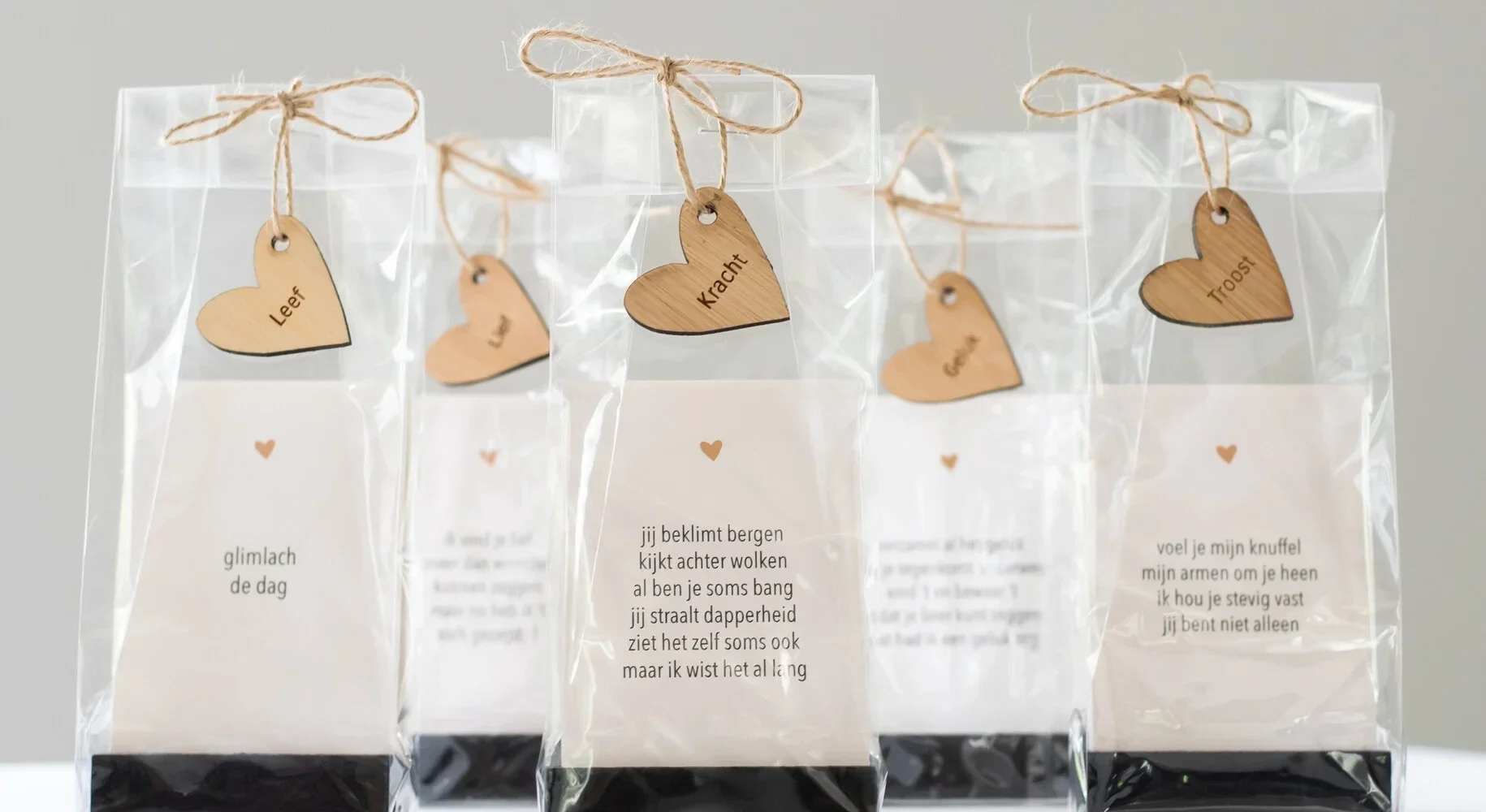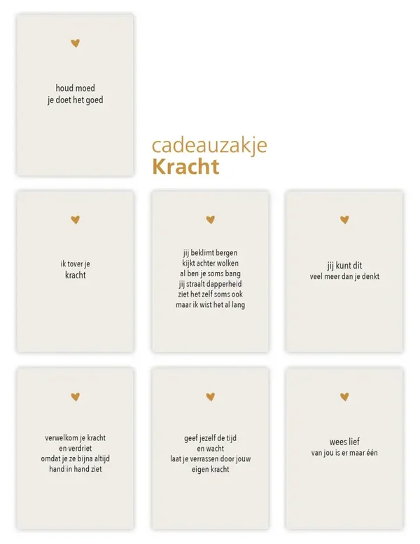 Cadeauzakje 'Kracht' is een leuk cadeautje om weg te geven of voor jezelf! We hebben 3 verschillende soorten cadeauzakjes met ieder een eigen thema: geluk, kracht of leef. De zakjes bestaan uit 7 verschillende kaartjes met hartgedichtjes inclusief een zwarte kaarthouder met dubbele sleuf en een bamboe hartje.